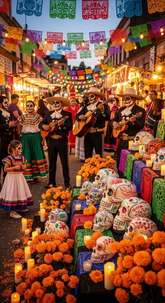 As famílias mexicanas reúnem-se em cemitérios, dançam, cantam e partilham refeições.