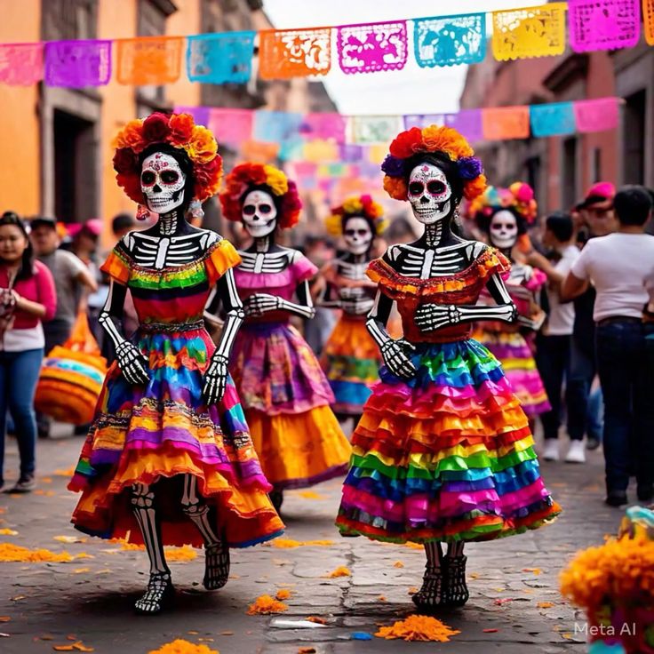 – As calaveras (caveiras) representam a aceitação da morte como parte da existência. Elas são coloridas, alegres, cheias de vida.
