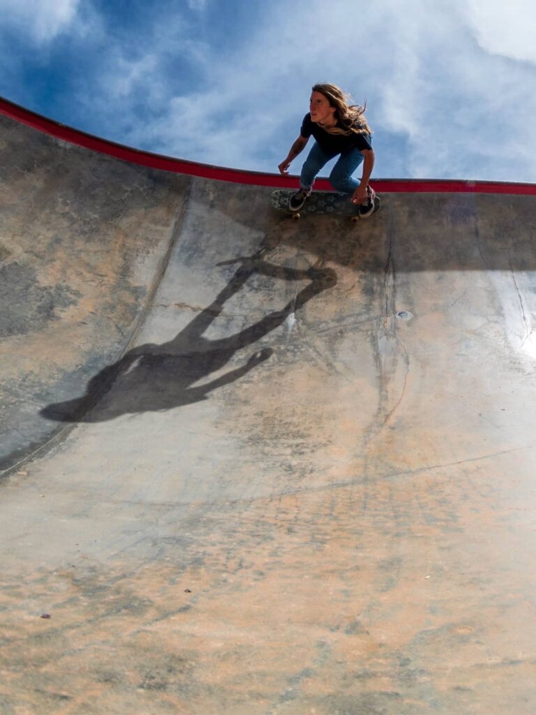 Definitivamente, ainda quero empurrar-me muito para além da minha zona de conforto e melhorar a minha performance, então daqui a 5 anos espero estar a andar muito mais rápido e a fazer coisas muito mais loucas. Também quero empoderar mais mulheres, sobretudo a próxima geração. Quero construir a minha própria organização para realizar eventos que façam as pessoas sentirem-se bem-vindas no mundo do skate e que as encorajem a sair da zona de conforto. Estou particularmente focada nas novas gerações porque sinto que as crianças estão perdidas no mundo digital e não estão a aprender a lidar com as suas emoções, o que é perigoso. A maioria delas aprende a empurrar as emoções para fora de si e a distrair-se. O skate é um ótimo instrumento para te aproximares de ti mesma e é isso mesmo que quero mostrar aos outros — como pode ser divertido aproximares-te de ti mesma, conheceres-te, redescobrires-te e reinventares-te.